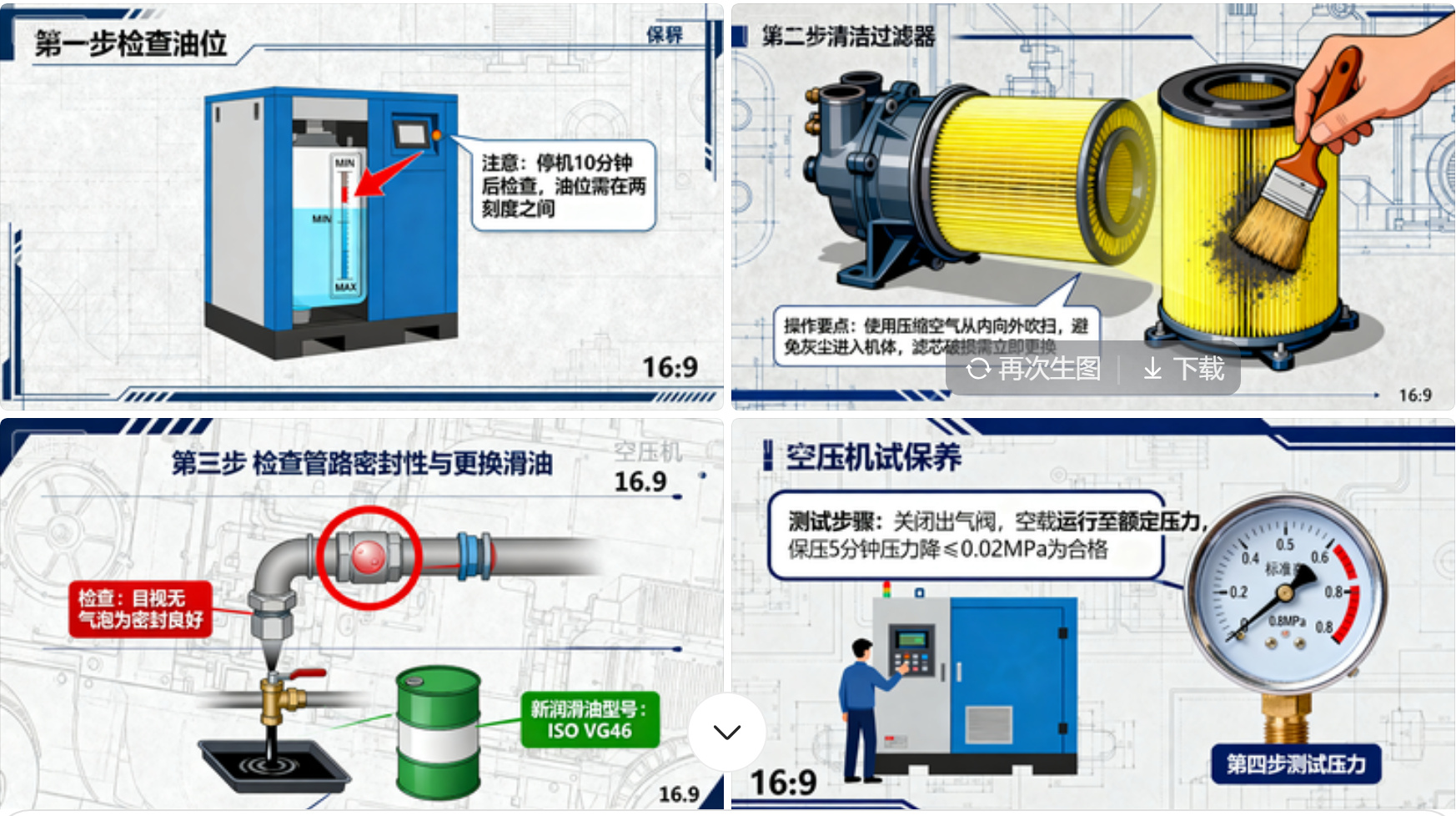 空压机的定期保养是确保其稳定运行和延长使用寿命的关键。以下表格汇总了各保养周期的核心任务,帮助您快速掌握要点。保养周期核心保养任务每日保养检查油位、压力/温度仪表读数;排放储气罐和过滤器中的冷凝水;检